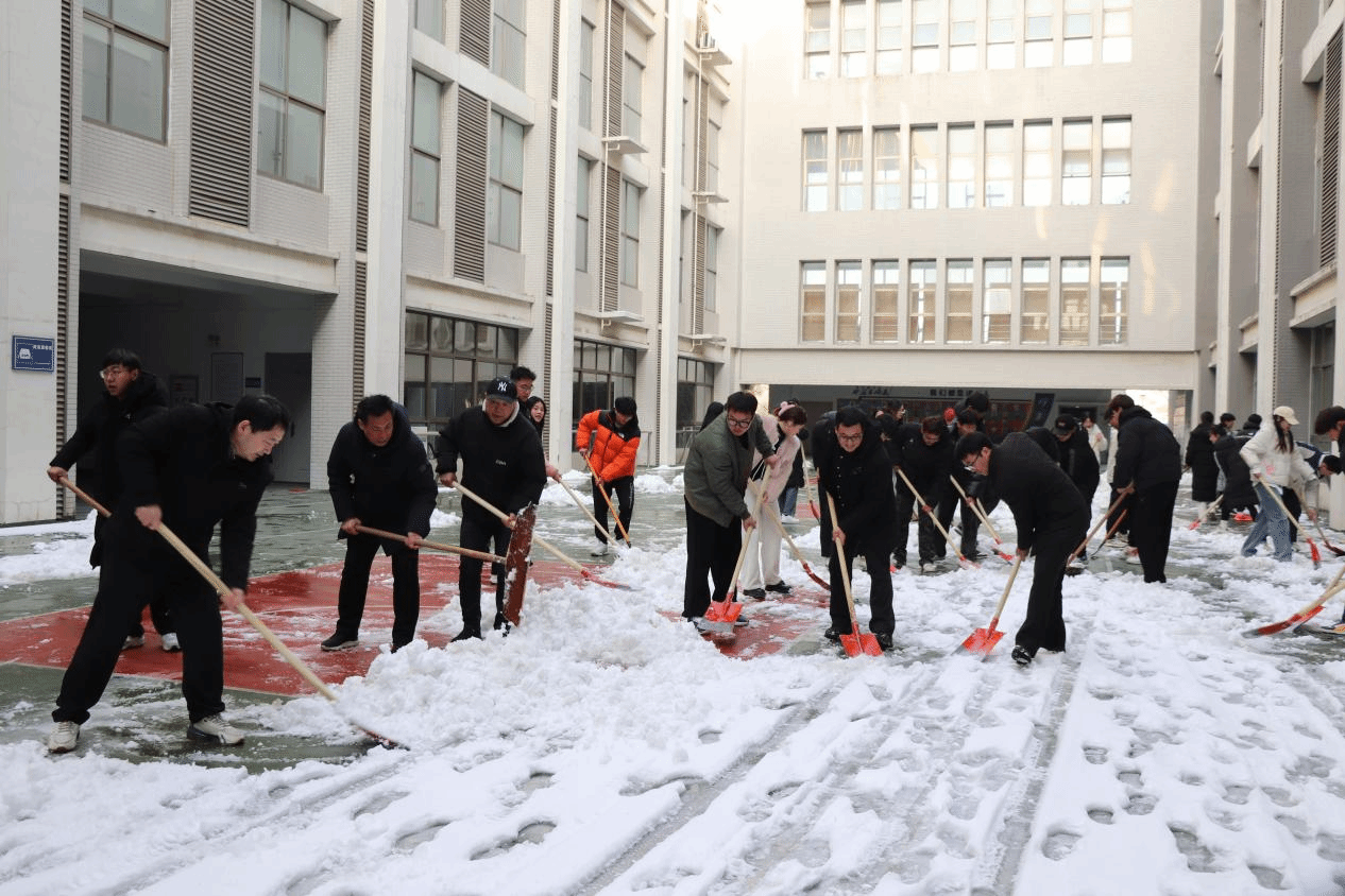 新学期新气象,2月25日,为保证开学第一天的教学活动正常进行,安博网页版领导班子成员、辅导员老师以及部分老师和主要学生干部,开展了扫雪除冰活动。