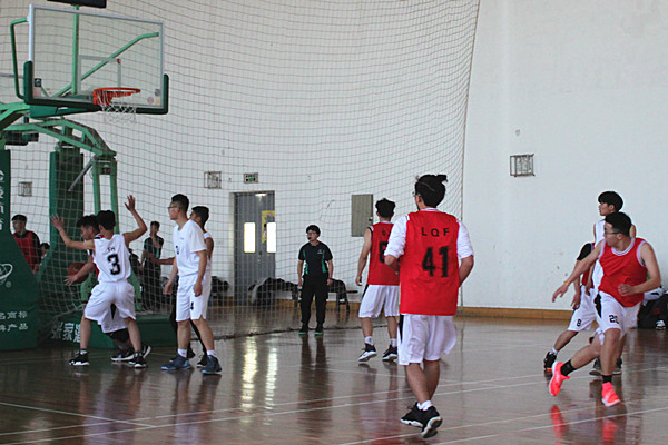 哨声一响,双方球员入场,裁判发球,随着两队队员高高跃起争球,比赛进入一个紧张的氛围。两方队员快速奔跑,积极投篮。只见带球队员一个反身带球避开防守,一个假动作带球向前,接着一个漂亮的三步投篮引起观众的欢呼和掌声。