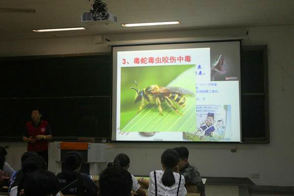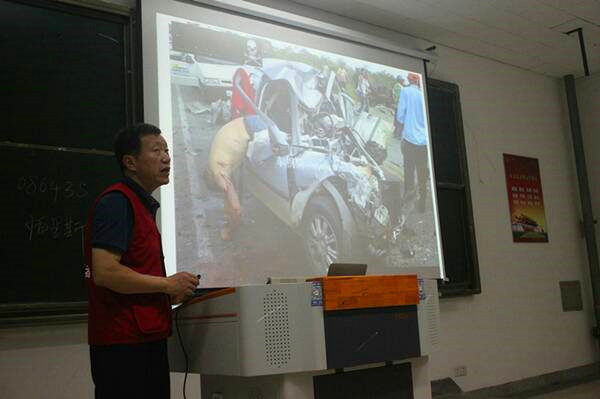 本次讲座围绕常见灾害事故现场救护和突发事件紧急逃生避险等内容展开。王兆军老师运用实例,给同学们在大学生在遭遇地震、洪水等灾害事故以及溺水,火灾等突发事件应该如何处理等方面提供示范。在讲到如果快速有效止血和包扎时,王老师邀请了现场的一位男同学上台进行示范,给同学们更直观的感受。