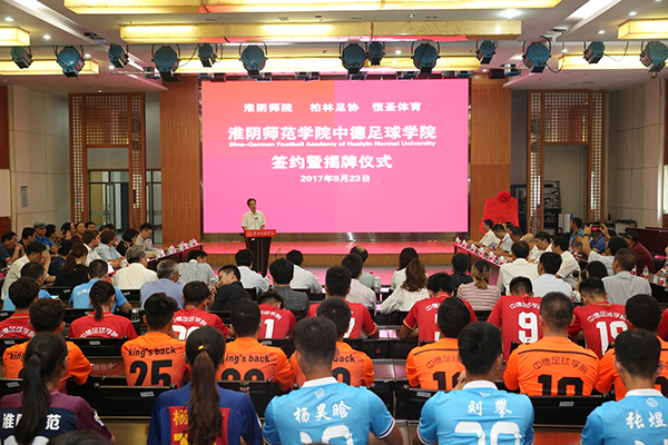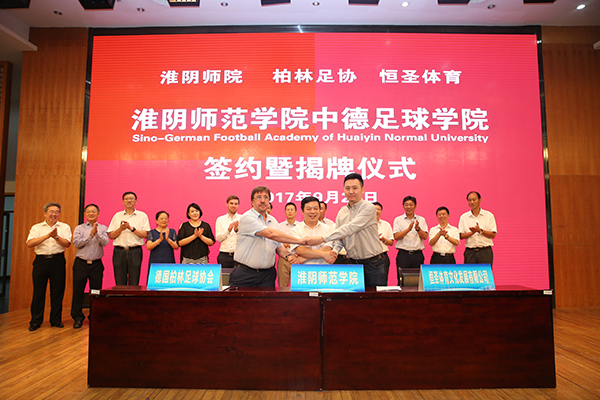 国家体育总局训练局行政处主任陆煜、淮阴师范学院党委书记朱汉清、德国柏林足协副主席里瑟刚和恒圣体育文化发展有限公司CEO胡良平共同为“淮阴师范学院中德足球学院”揭牌,淮阴师范学院校长朱林生、德国柏林足协青训总监沙尔洛夫斯基、恒圣体育发展有限公司CEO胡良平代表甲乙丙三方,签署“淮阴师范学院中德足球学院三方合作协议”,并互赠礼品。教育部体卫艺司体育处副处长许弘、江苏省教育厅体卫艺处处长张鲤鲤、淮阴师范学院党委副书记、纪委书记顾建国、淮安市教育局局长张元贵及北京体育大学、南通大学、南京工业大学、全国高校体育教学指导委员会专家学者出席签约揭牌仪式,淮阴师范学院副校长施军主持仪式。