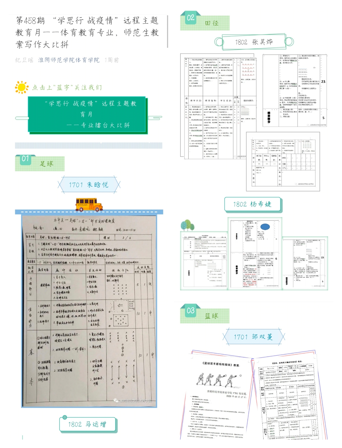 学院运用QQ、微信等新媒体平台开展疫情防控知识线上专题宣讲;教师通过爱课程、中国大学mooc、超星、智慧树、微信等软件实现在线教学;社会体育专业同学发挥专业特长在家录制简单易行的健身知识小课堂,倡导大家积极参加体育锻炼,养成健康生活方式;体育教育专业同学瞄准教师资格证面试、考编考研,利用疫情期间在家认真打磨一份教学教案,并分享学习成果;体育舞蹈专业同学发挥专业特长,进行“专业舞美大比拼”。