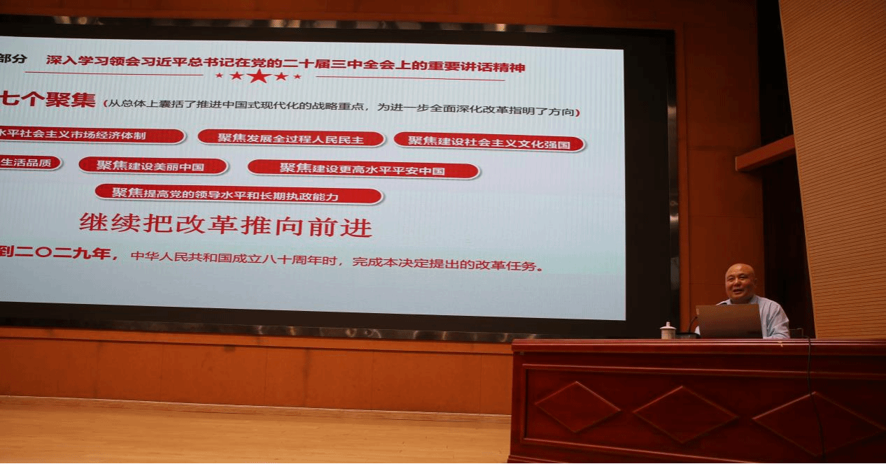 淮安市委宣讲团成员、淮师马克思主义学院党委书记刘小华作题为《以进一步全面深化改革开辟中国式现代化广阔前景》的宣讲报告。刘小华从深刻认识党的二十届三中全会的重大意义、深入领会习近平总书记在全会上的重要讲话精神、全面把握全会《中共中央关于进一步全面深化改革、推进中国式现代化的决定》的主要内容、抓好全会精神贯彻落实等方面,结合工作实际,作了系统阐释和重点解读。
