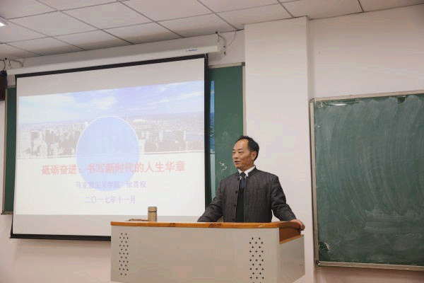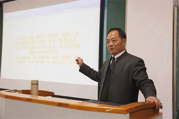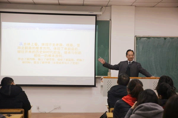 徐老师退休前一直在教学第一线,其有力度、有深度的讲课方式一直受到学生的喜欢,此次受到安博网页版邀请,徐老师专门精心制作PPT,用简单直观又有深度地语言为学生解读十九大。他从十九大报告结构分析入手:五年总结和重大判断、使命宣告、新思想和基本方略、目标和步骤、总体部署五个单元,分为八个方面为学生解读,重点解析如何把握我国社会主要矛盾的变化、如何认识全面建成小康社会和社会主义现代化强国、如何理解我们青年学生的重大历史使命等学生疑惑的关键问题。