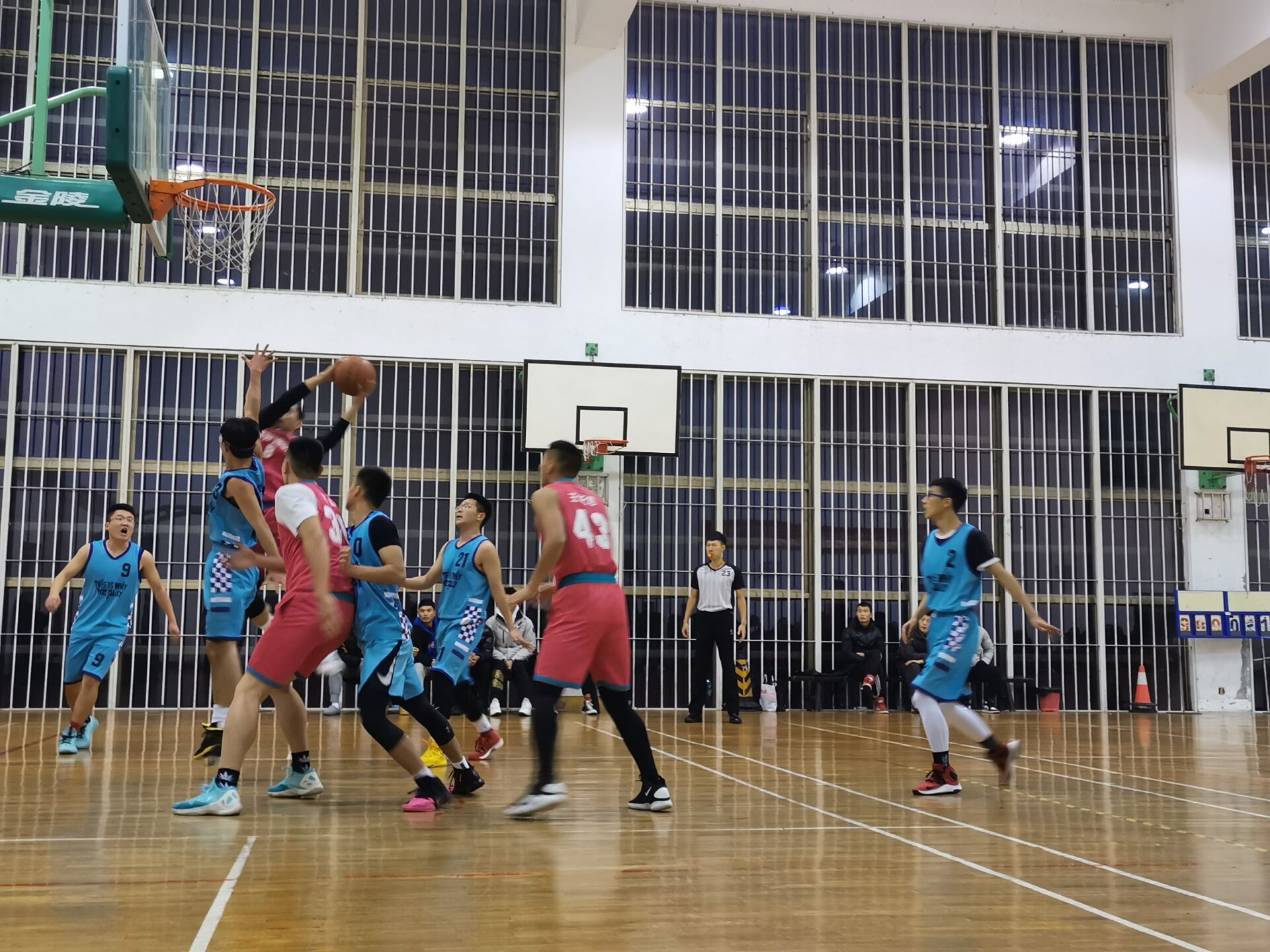 在比赛一开始,其激烈程度不言而喻,双方都使出浑身解数。1705班率先夺下两分,1803班也不甘示弱,随后在彼此的默契配合下,在观众的呐喊声中也拿下了两分。然而1803班的奋力拼搏,积极进攻终究敌不过1705班,输掉了此次比赛。1705班凭借着滴水不漏的团队防守,配合流畅的整体进攻和命中率极高的三分投篮,以54:37的得分赢得本场比赛。