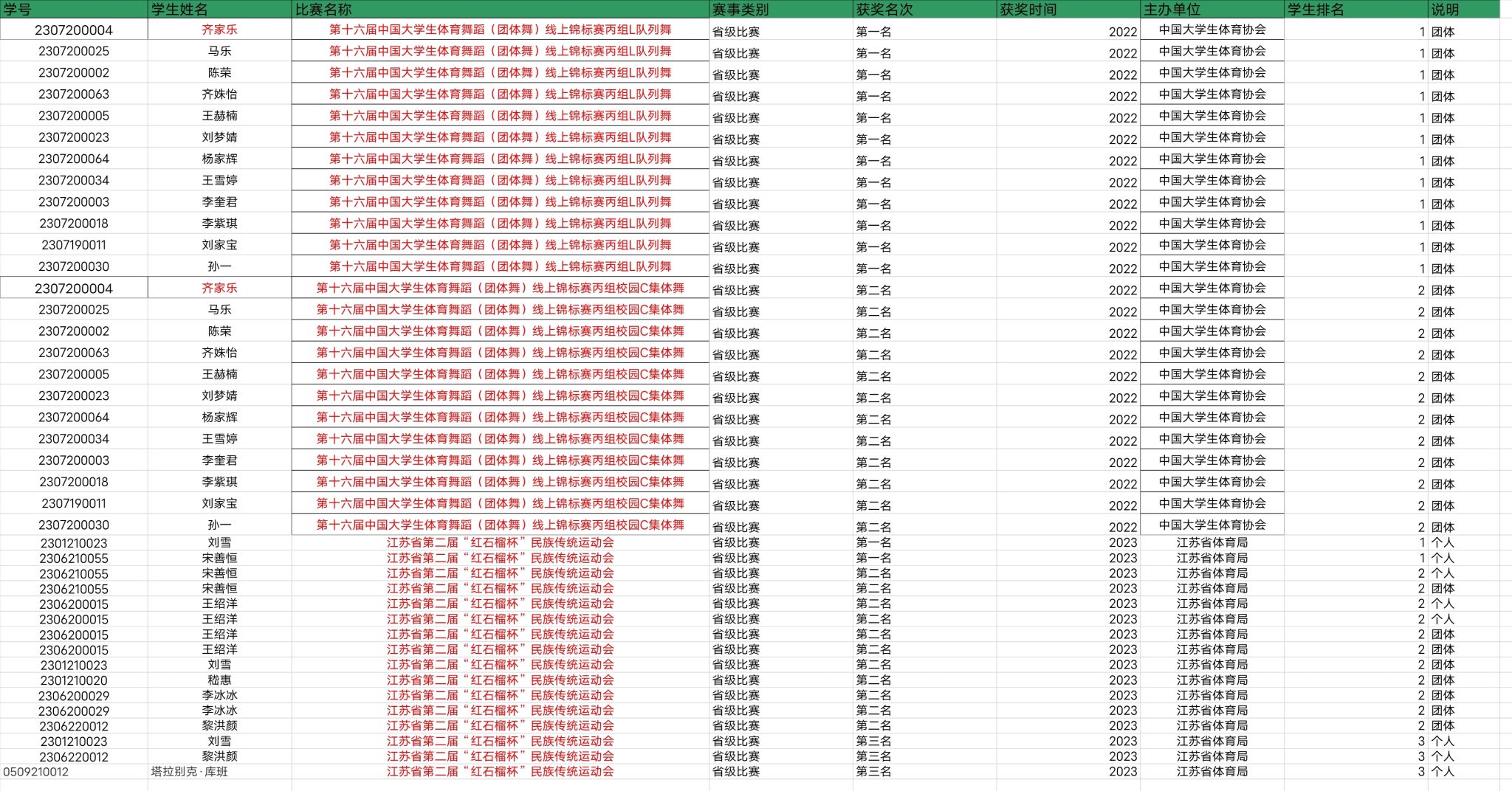 学生获专业比赛奖励情况(体育类专业用)